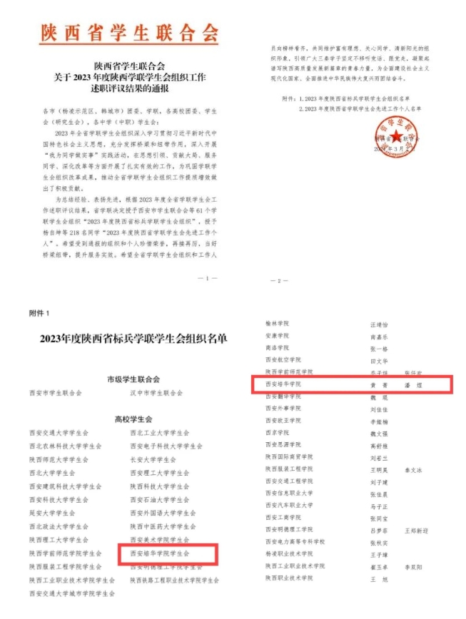 近日,陕西省学生联合会下发了《关于2023年度陕西学联学生会组织工作述职评议结果的通报》,西安培华学院学生会组织获评“2023年度陕西省标兵学联学生会”,学生干部黄菁、潘煜获评“2023年度陕西省学联学生会先进工作个人”。