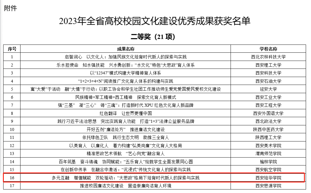 近日,陕西省委教育工委公布了2023年全省高校校园文化建设优秀成果评选结果,学校申报的校园文化建设项目《多元互融、增值赋能、双轮驱动——“大思政”格局下培育时代新人的探索与实践》荣获二等奖。