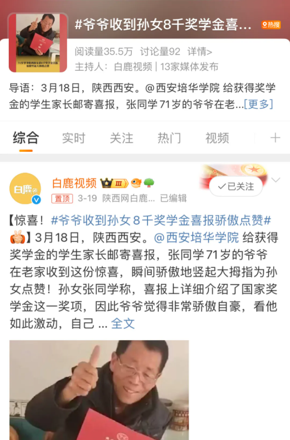 #爷爷收到孙女8千奖学金喜报骄傲点赞#这一话题冲上微博热搜,引发了多家媒体的热议。看着最爱的家人收到喜报时的自豪与激动,喜悦的分享收获了加倍的快乐。