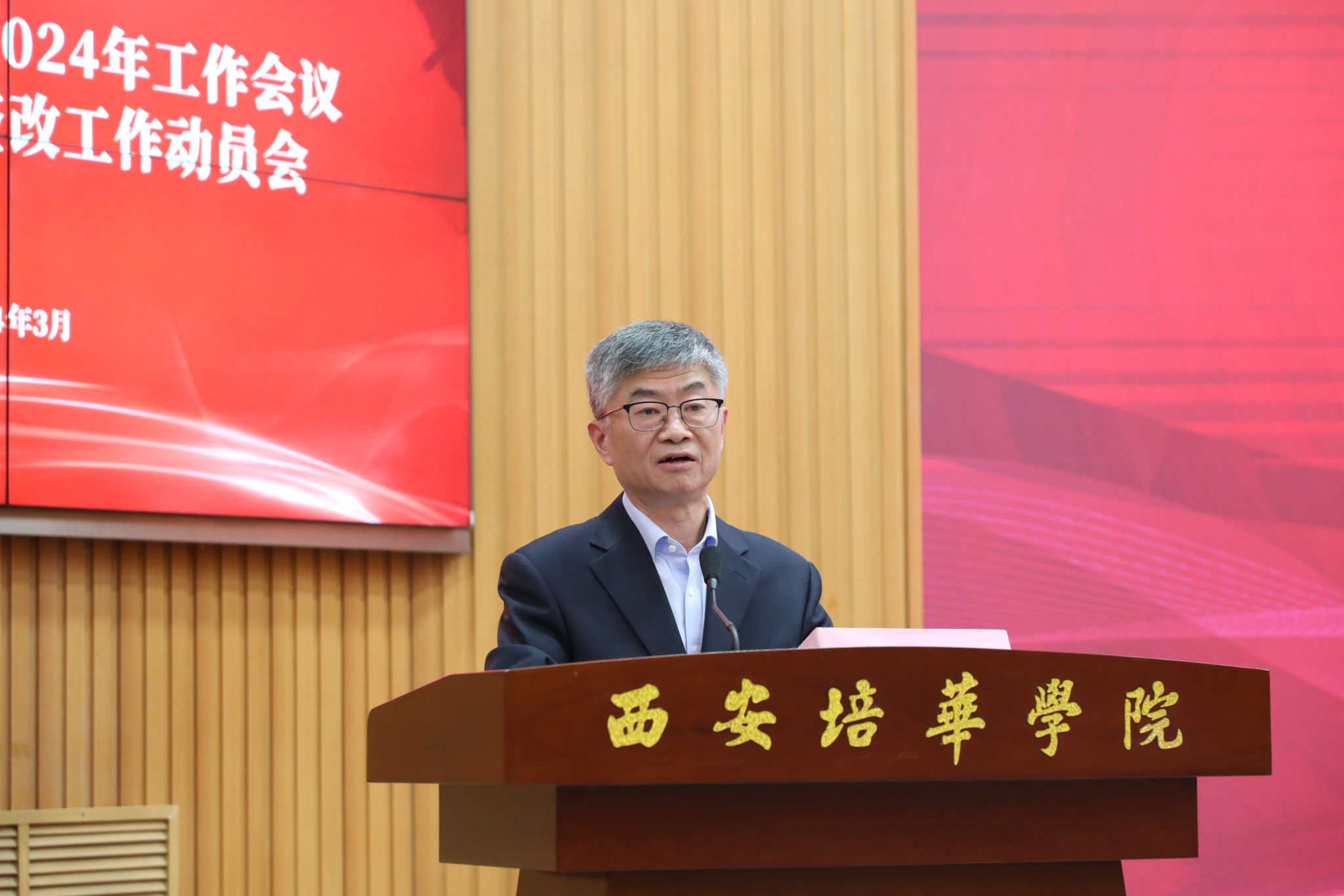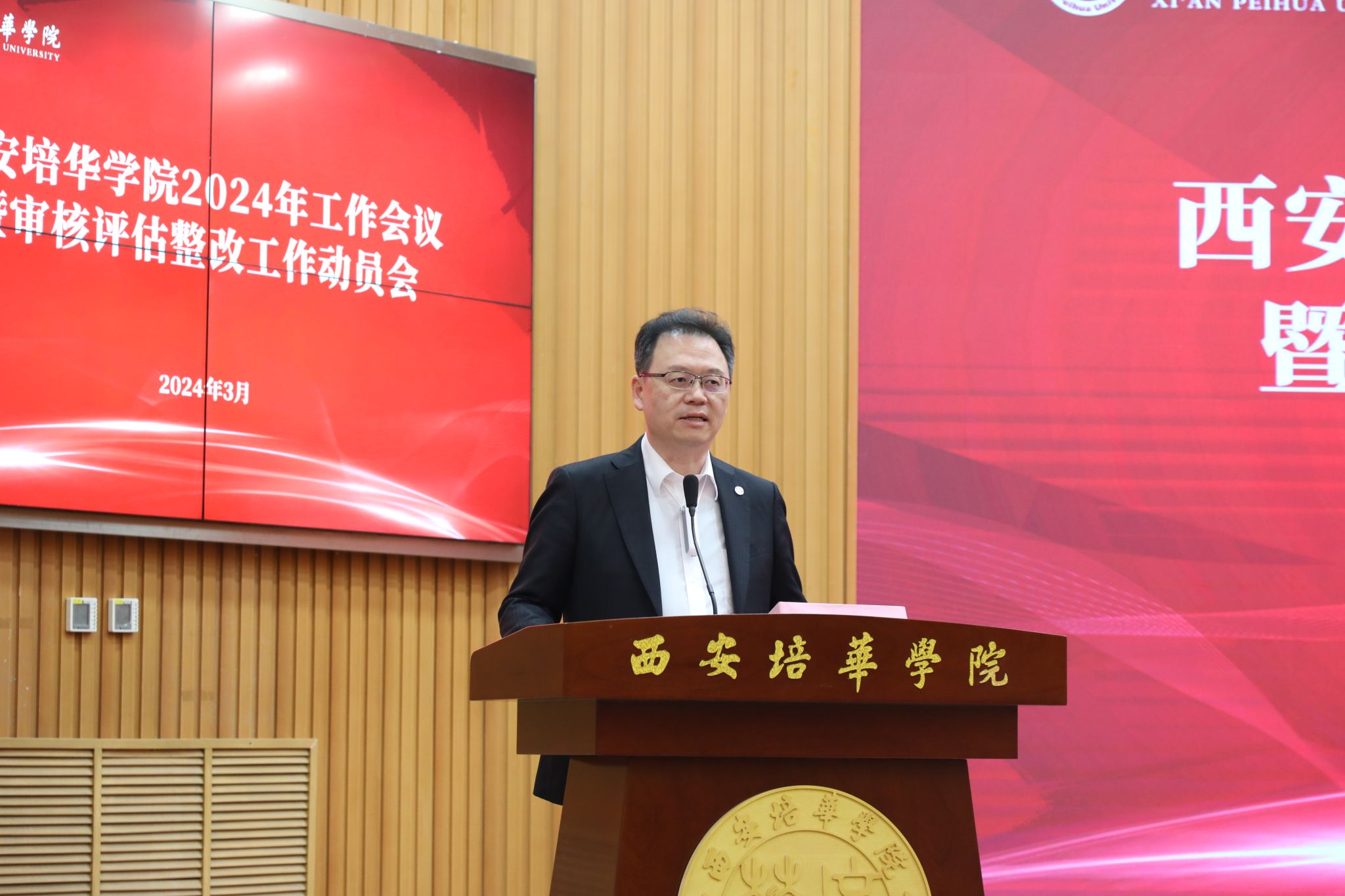 3月27日下午,学校在明德楼报告厅召开2024年工作会议暨审核评估整改工作动员会。全体校领导、教师代表、行政部门主管岗位以上人员等200余人参加本次会议。会议由党委书记刘锋主持。