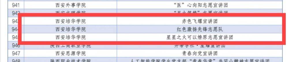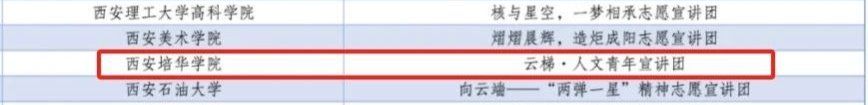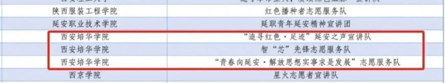 其中,传媒与设计学院申报的赤色飞耀宣讲团、红色激扬先锋志愿队、星星之火可以燎原志愿宣讲团3支队伍成功入选“延安”精神志愿宣讲团;传媒与设计学院申报的“追寻红色·足迹”延安之声宣讲队、“青春向延安·解放思想实事求是发展”志愿服务队,智能科学与工程学院申报的智“芯”先锋志愿服务队成功入选“井冈山”精神志愿宣讲团;人文与国际教育学院申报的云梯·人文青年宣讲团入选“两弹一星”精神志愿宣讲团。