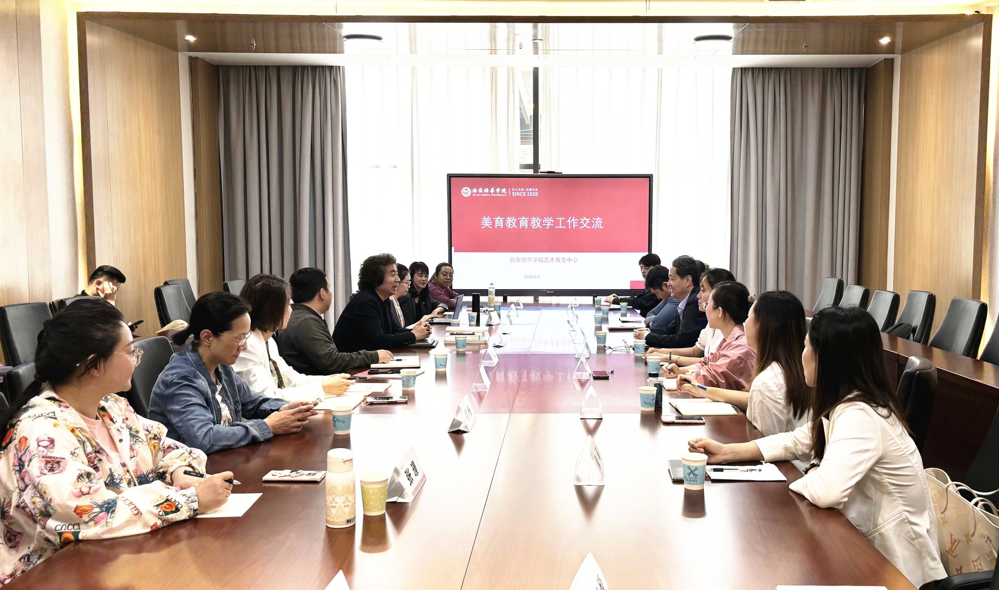 学校艺术教育中心主任刘荣弟围绕西安培华学院美育教育教学成果、艺术课程思政沙龙、大学生艺术展演、美育大讲堂、艺术课程学习交流分享会、高雅艺术进校园等各类校园文化艺术活动等进行详细介绍。双方就大学生艺术团建设、课程教学、师资建设等方面进行了广泛的交流和深入的探讨。