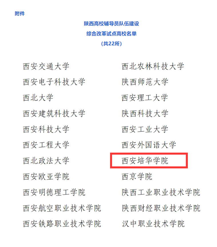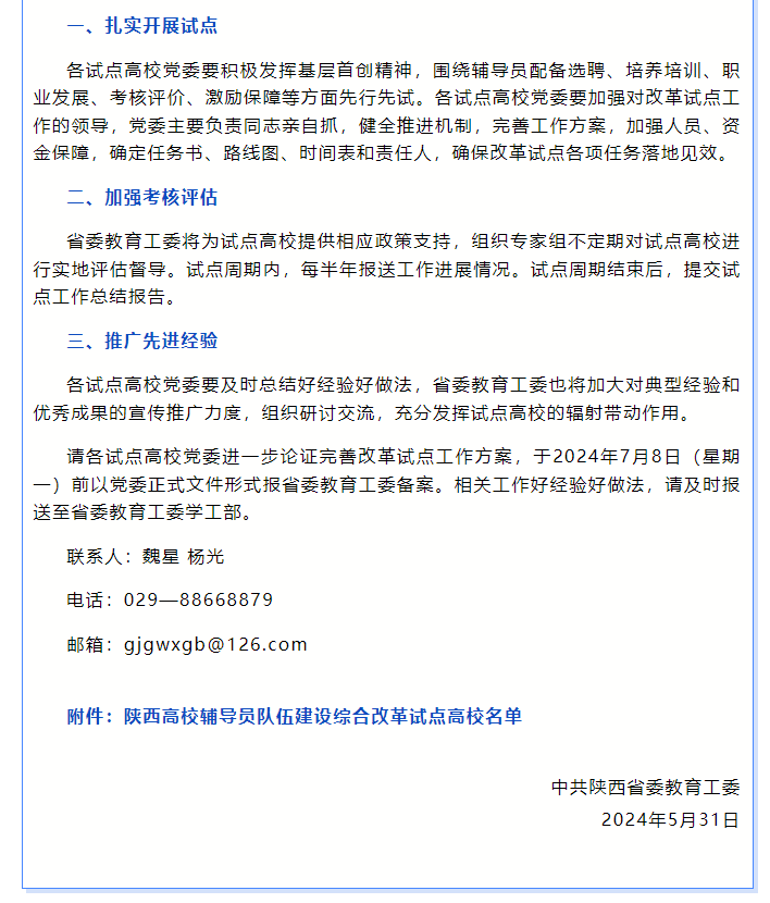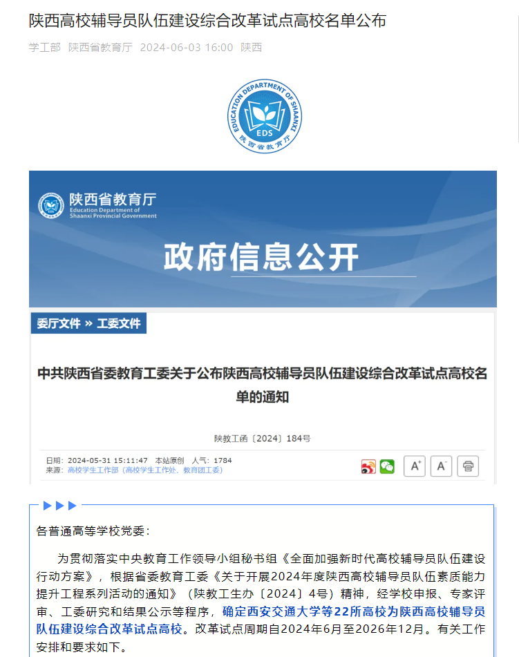 6月3日,《中共陕西省委教育工委关于公布陕西高校辅导员队伍建设综合改革试点高校名单的通知》(陕教工函〔2024〕184号)发布。学校成功入选陕西高校辅导员队伍建设综合改革试点高校。改革试点周期自2024年6月至2026年12月。省委教育工委将为试点高校提供相应政策支持,组织专家组不定期对试点高校进行实地评估督导,加大对典型经验和优秀成果的宣传推广力度,组织研讨交流,充分发挥试点高校的辐射带动作用。