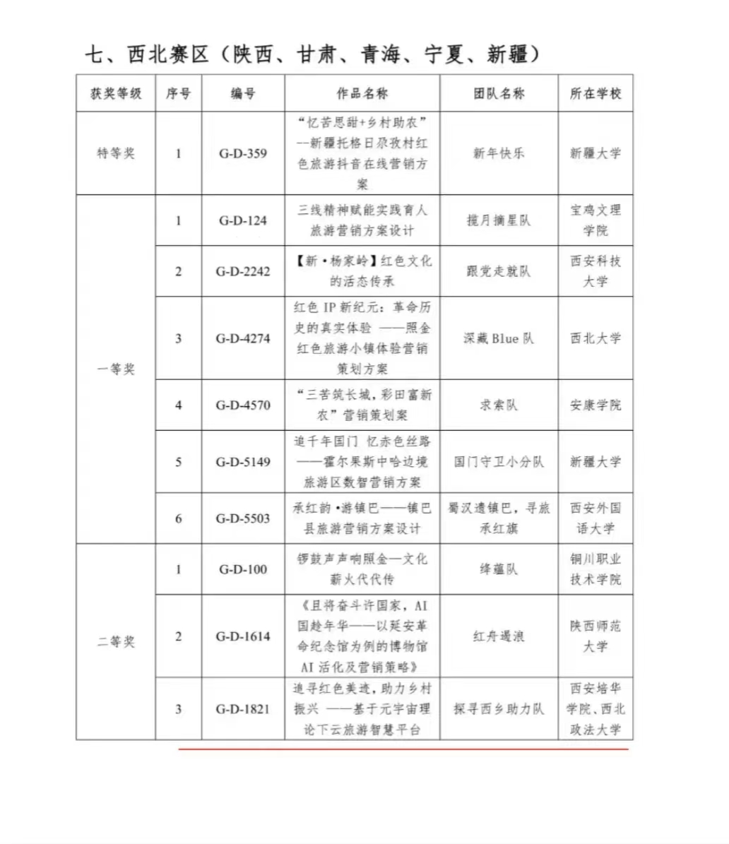 近日,由文化和旅游部资源开发司、国家发展改革委社会发展司、共青团中央宣传部、北京第二外国语学院主办的第十四届全国大学生红色旅游创意策划大赛初赛获奖名单公布。自备赛以来,会计与金融学院江凤香老师带领学生肖玉玲、周家敏等五人,不断打磨作品,刻苦钻研,最终,学校荣获红色旅游营销方案设计类作品西北赛区二等奖。