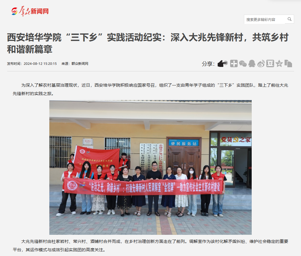 为深入了解农村基层治理现状,近日,西安培华学院积极响应国家号召,组织了一支由青年学子组成的“三下乡”实践团队,踏上了前往大兆先锋新村的实践之旅。