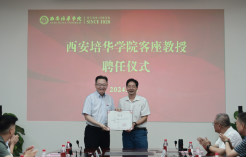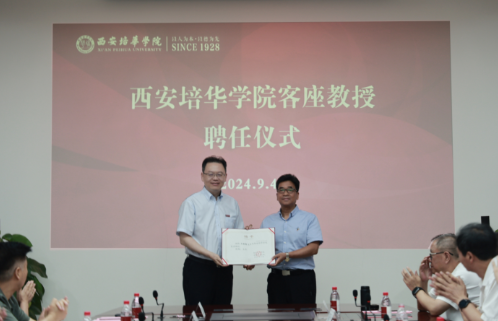 在客座教授聘任仪式环节,省决咨委民生组副组长、西安理工大学原党委书记刘德安教授,省决咨委委员、陕西省发改委原副主任王振海受聘为西安培华学院客座教授,姜波理事长向其颁发了客座教授聘书,并亲自佩戴校徽。