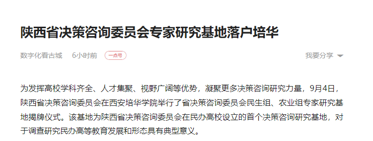 为发挥高校学科齐全、人才集聚、视野广阔等优势,凝聚更多决策咨询研究力量,9月4日,陕西省决策咨询委员会在西安培华学院举行了省决策咨询委员会民生组、农业组专家研究基地揭牌仪式。该基地为陕西省决策咨询委员会在民办高校设立的首个决策咨询研究基地,对于调查研究民办高等教育发展和形态具有典型意义。
