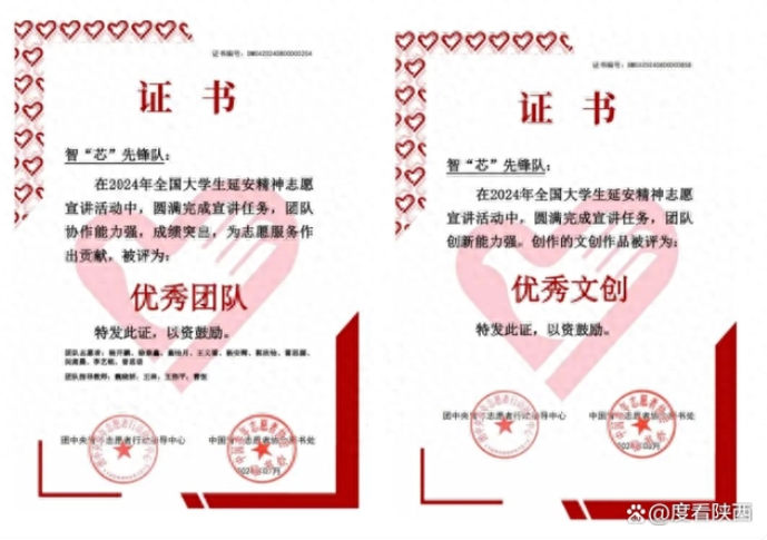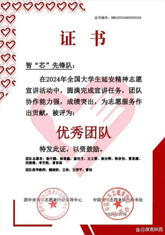 近日,团中央青年志愿者行动指导中心、中共延安市委、共青团贵州省委联合举办的2024年全国大学生延安会议宣讲团项目发布了全国优秀团队评选结果,西安培华学院智“芯”先锋队圆满完成任务,在全国1000支队伍中脱颖而出,荣获2024年全国大学生延安精神志愿宣讲“优秀团队”“优秀文创”称号,杨开鹏、童怡月等10名团队成员荣获表彰。