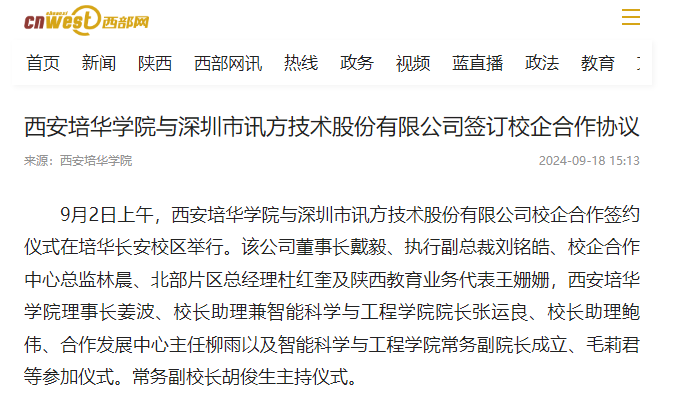 9月2日上午,西安培华学院与深圳市讯方技术股份有限公司校企合作签约仪式在培华长安校区举行。该公司董事长戴毅、执行副总裁刘铭皓、校企合作中心总监林晨、北部片区总经理杜红奎及陕西教育业务代表王姗姗,西安培华学院理事长姜波、校长助理兼智能科学与工程学院院长张运良、校长助理鲍伟、合作发展中心主任柳雨以及智能科学与工程学院常务副院长成立、毛莉君等参加仪式。常务副校长胡俊生主持仪式。