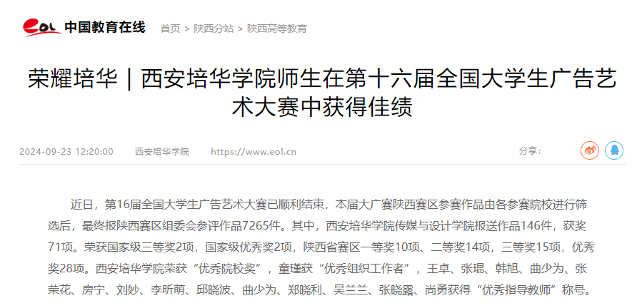 近日,第16届全国大学生广告艺术大赛已顺利结束,本届大广赛陕西赛区参赛作品由各参赛院校进行筛选后,最终报陕西赛区组委会参评作品7265件。其中,西安培华学院传媒与设计学院报送作品146件,获奖71项。荣获国家级三等奖2项,国家级优秀奖2项,陕西省赛区一等奖10项、二等奖14项,三等奖15项,优秀奖28项。西安培华学院荣获“优秀院校奖”,童瑾获“优秀组织工作者”,王卓、张琨、韩旭、曲少为、张荣花、房宁、刘妙、李昕萌、邱晓波、曲少为、郑晓利、吴兰兰、张晓露、尚勇获得“优秀指导教师”称号。
