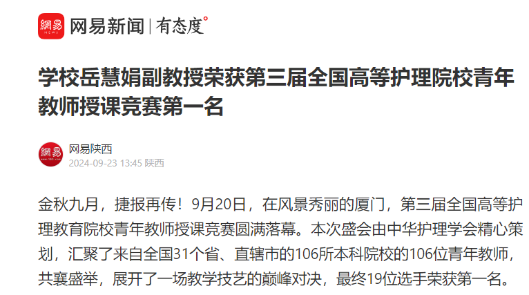 金秋九月,捷报再传!9月20日,在风景秀丽的厦门,第三届全国高等护理教育院校青年教师授课竞赛圆满落幕。本次盛会由中华护理学会精心策划,汇聚了来自全国31个省、直辖市的106所本科院校的106位青年教师,共襄盛举,展开了一场教学技艺的巅峰对决,最终19位选手荣获第一名。
