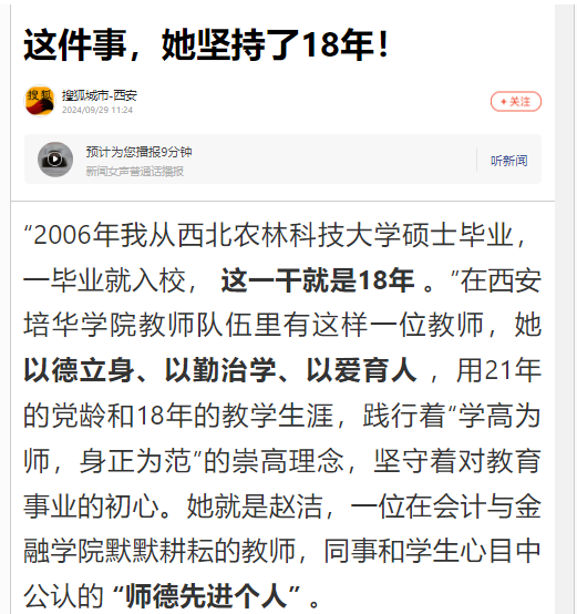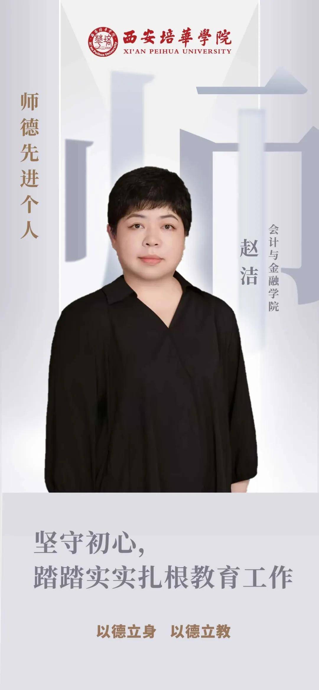 “2006年我从西北农林科技大学硕士毕业,一毕业就入校,这一干就是18年。”在西安培华学院教师队伍里有这样一位教师,她以德立身、以勤治学、以爱育人,用21年的党龄和18年的教学生涯,践行着“学高为师,身正为范”的崇高理念,坚守着对教育事业的初心。她就是赵洁,一位在会计与金融学院默默耕耘的教师,同事和学生心目中公认的“师德先进个人”。
