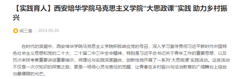 在时代的浪潮中,西安培华学院马克思主义学院积极响应党的号召,深入学习宣传贯彻习近平新时代中国特色社会主义思想和党的二十大、二十届二中、三中全会精神,特别是习近平总书记关于青年工作的重要思想,以及历次来陕考察重要讲话重要指示,将理论与实践深度融合,创新性地开展了一系列“大思政课”实践活动。这些活动不仅是一次次知识的探索之旅,更是一场场心灵与责任的觉醒,让青春在乡村振兴与法治教育的广阔舞台上绽放出最耀眼的光芒。