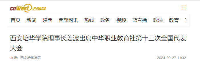9月24日至25日,中华职业教育社第十三次全国代表大会在京举行。西安培华学院理事长姜波以中华职教社第十二届理事会理事身份受邀参会。期间,姜波向与会领导和代表介绍了西安培华学院的历史轨迹和特色优势,阐释了学校特色鲜明的“红色基因、统战基因、职教基因和女性教育基因”四大基因。特别是介绍了学校是中华职教社在陕的唯一分校的历史,表示培华之所以发展到今天,且有质量、有规模、有知名度,与培华职教基因的传承密不可分。