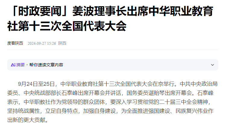 9月24日至25日,中华职业教育社第十三次全国代表大会在京举行。中共中央政治局委员、中央统战部部长石泰峰出席开幕会并讲话,国务委员谌贻琴出席开幕会。石泰峰表示,中华职教社作为党领导的群众团体,要深入学习贯彻党的二十届三中全会精神,坚持统战属性,立足自身特点,加强自身建设,为全面推进强国建设、民族复兴伟业作出新的更大贡献。