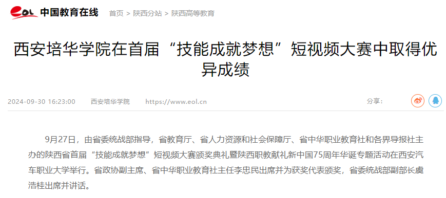 9月27日,由省委统战部指导,省教育厅、省人力资源和社会保障厅、省中华职业教育社和各界导报社主办的陕西省首届“技能成就梦想”短视频大赛颁奖典礼暨陕西职教献礼新中国75周年华诞专题活动在西安汽车职业大学举行。省政协副主席、省中华职业教育社主任李忠民出席并为获奖代表颁奖,省委统战部副部长虞浩桂出席并讲话。