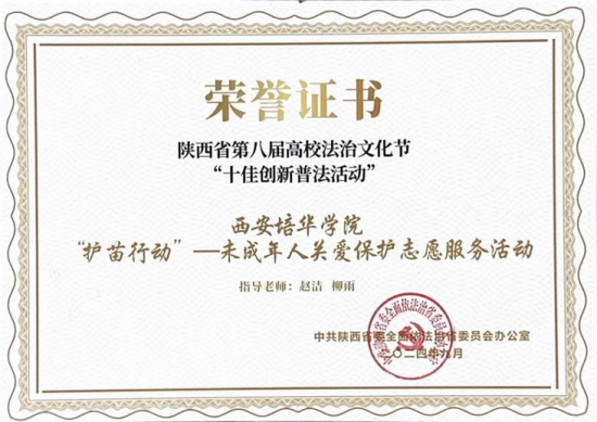 启动仪式上,对第八届高校法治文化节“法典先锋”冲关答题挑战赛、优秀法治文化作品、十佳创新普法活动、优秀组织单位等获奖单位及个人进行了通报表彰。学校法学院2023级1班张灿同学凭借扎实的法律知识和快速的应变能力在“法典先锋”冲关答题挑战赛中荣获一等奖。学校推荐的《“护苗行动”——未成年人关爱保护志愿服务活动》荣获“十佳创新普法活动”称号。西安培华学院荣获“优秀组织单位”奖。