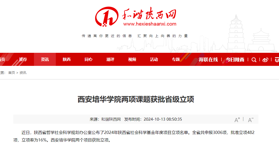 近日,陕西省哲学社会科学规划办公室公布了2024年陕西省社会科学基金年度项目立项名单。全省共申报3006项,批准立项482项,立项率为16%。西安培华学院两个项目获批立项。