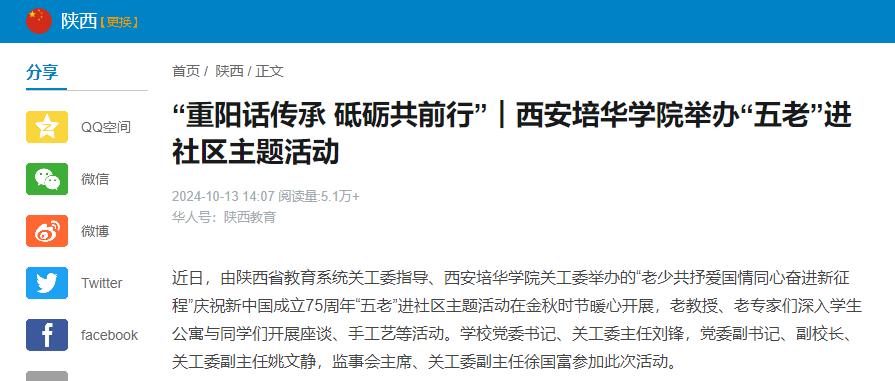 近日,由陕西省教育系统关工委指导、西安培华学院关工委举办的“五老”进社区主题活动在金秋时节暖心开展,老教授、老专家们深入学生公寓与同学们开展座谈、手工艺等活动。校党委书记、关工委主任刘锋,党委副书记、副校长、关工委副主任姚文静,监事会主席、关工委副主任徐国富参加此次活动。