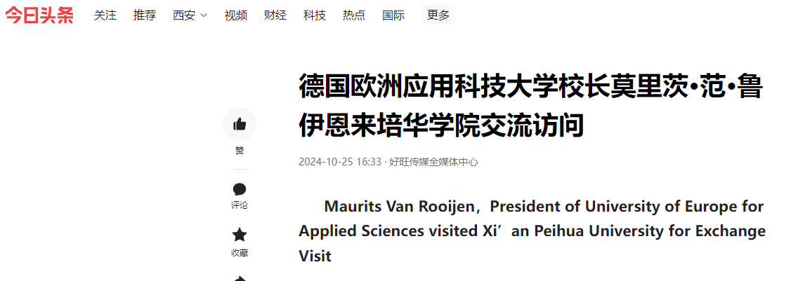 10月16日,德国欧洲应用科技大学校长莫里茨·范·鲁伊恩来校交流访问。西安培华学院理事长姜波博士、副校长刘越莲教授、国际校长李华教授、国际交流中心主任王鹏与来宾座谈交流,并举行签约仪式。
