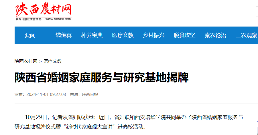 10月29日,记者从省妇联获悉:近日,省妇联和西安培华学院共同举办了陕西省婚姻家庭服务与研究基地揭牌仪式暨“新时代家庭观大宣讲”进高校活动。