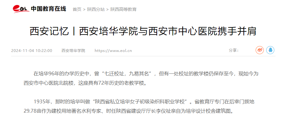 在培华96年的办学历史中,曾“七迁校址,九易其名”,但有一处校址的教学楼仍保存至今,现如今为西安市中心医院北院楼,这座具有72年历史的老教学楼。