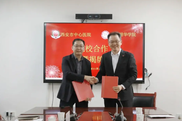 西安培华学院与西安市中心医院校企合作签约仪式在医院举行。在签约仪式上,姜波理事长表示,西安市中心医院北院楼见证了西安的历史变迁,佐证了校院双方发展的不凡轨迹,是双方共同的精神传承和文化标志,学校愿与医院联手做好文物的挖掘、保护和传承工作,打造一个校院合作的红色标杆;他希望与院方通过产教融合,在人才培养、科学研究、成果转化等领域进行全方位合作,实现双方共同发展。