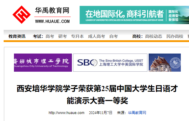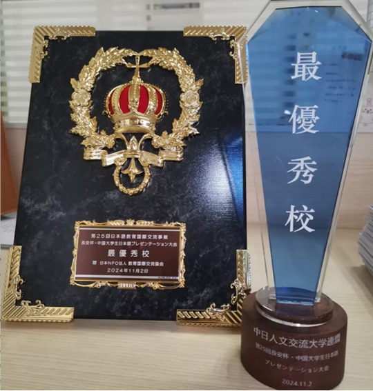 11月2日,第25届中国大学生日语才能演示大赛在西安外国语大学长安校区举行。西安培华学院人文与国际教育学院外语系日语专业2022级王静怡同学获得一等奖,并获得受邀访问日本的机会,小泽一博老师获优秀指导奖。西安培华学院获最优秀院校奖。