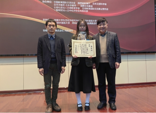 大赛分为作文比赛和日语演讲两个环节,王静怡同学在这两个环节均获得最高分。作文要求从一个中日交流的实例展开,阐述对日本的影响。演讲环节要求选手通过PPT展示,向日本的中学生介绍西安的历史文物、名胜古迹,推荐旅游线路,吸引日本的青少年来西安修学旅游。王静怡同学的演讲语言流畅,内容契合主题,表现力强,给评委和现场观众都留下了深刻印象。