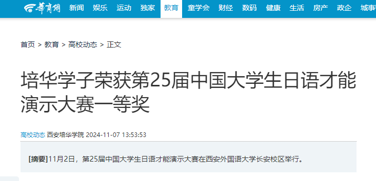 11月2日,第25届中国大学生日语才能演示大赛在西安外国语大学长安校区举行。西安培华学院人文与国际教育学院外语系日语专业2022级王静怡同学获得一等奖,并获得受邀访问日本的机会,小泽一博老师获优秀指导奖。西安培华学院获最优秀院校奖。