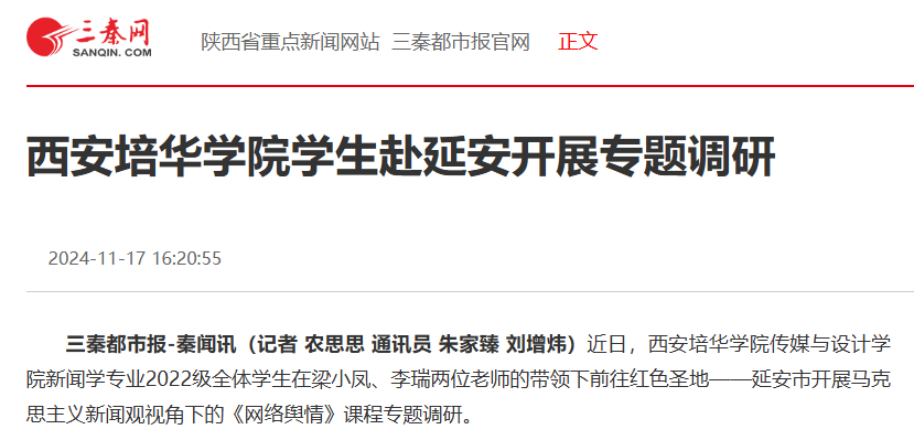 近日,西安培华学院传媒与设计学院新闻学专业2022级全体学生在梁小凤、李瑞两位老师的带领下前往红色圣地——延安市开展马克思主义新闻观视角下的《网络舆情》课程专题调研。