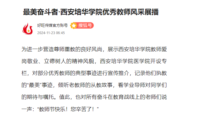 为进一步营造尊师重教的良好风尚,展示西安培华学院教师爱岗敬业、立德树人的精神风貌,西安培华学院医学院开设专栏,对部分优秀教师的典型事迹进行宣传推介,记录他们执教的“最美”事迹,倾听老教师的从教故事,看学业导师对同学们的期待与嘱托。值此,也对所有奋斗在教育战线上的老师们说一声:“教师节快乐!您辛苦了!”