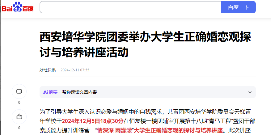 为了引导大学生深入认识恋爱与婚姻中的自我需求,共青团西安培华学院委员会云梯青年学校于2024年12月5日18点30分在恒友楼一楼团辅室开展第十八期“青马工程”暨团干部素质能力提升训练营—“情深深 雨濛濛”大学生正确婚恋观的探讨与培养讲座。此次讲座特别邀请到了吕改莲老师为我们带来了精彩的讲解。旨在帮助同学们在恋爱中保持理性尊重,学习健康积极的相处模式与沟通技巧,避免不良情感问题,为未来生活和个人情感稳定打下坚实基础。