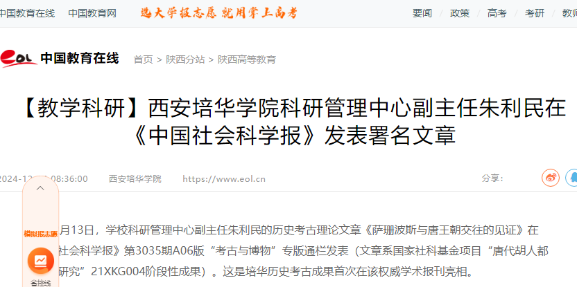12月13日,学校科研管理中心副主任朱利民的历史考古理论文章《萨珊波斯与唐王朝交往的见证》在《中国社会科学报》第3035期A06版“考古与博物”专版通栏发表(文章系国家社科基金项目“唐代胡人都市生活研究”21XKG004阶段性成果)。这是培华历史考古成果首次在该权威学术报刊亮相。