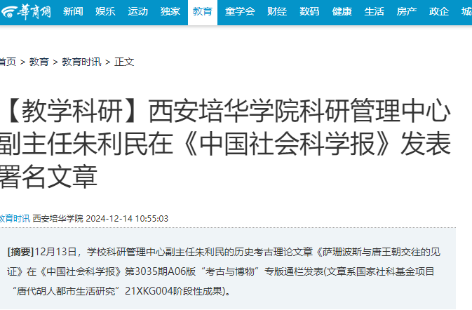 12月13日,学校科研管理中心副主任朱利民的历史考古理论文章《萨珊波斯与唐王朝交往的见证》在《中国社会科学报》第3035期A06版“考古与博物”专版通栏发表(文章系国家社科基金项目“唐代胡人都市生活研究”21XKG004阶段性成果)。这是培华历史考古成果首次在该权威学术报刊亮相。