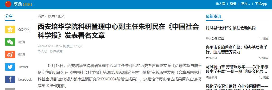 12月13日,西安培华学院科研管理中心副主任朱利民的历史考古理论文章《萨珊波斯与唐王朝交往的见证》在《中国社会科学报》第3035期A06版“考古与博物”专版通栏发表(文章系国家社科基金项目“唐代胡人都市生活研究”21XKG004阶段性成果)。这是培华历史考古成果首次在该权威学术报刊亮相。