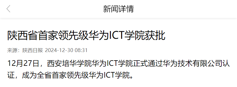 12月27日,西安培华学院华为ICT学院正式通过华为技术有限公司认证,成为全省首家领先级华为ICT学院。