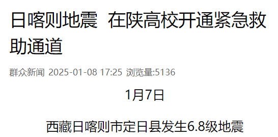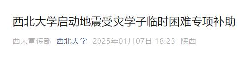 2025年1月7日9时5分在西藏日喀则市定日县(北纬28.50度,东经87.45度)发生6.8级地震,震源深度10千米。为帮扶受灾学生渡过难关,保障受灾学生的学习和生活,学校决定启动临时困难的专项救助工作,如果你的家庭因地震导致临时困难,请及时联系辅导员,申请临时困难救助。