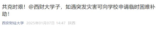 学校高度关注,时刻牵挂每一位同学,如果有同学因本次灾害造成人员伤亡或经济损失,导致家庭经济出现临时困难,请第一时间联系辅导员老师,向学院说明情况,经由学院向学生资助管理中心提交《西安石油大学临时困难补助申请表》,我们将积极应对并及时为西石大学子提供关心和帮扶,解决实际困难,保障同学们的学习生活。