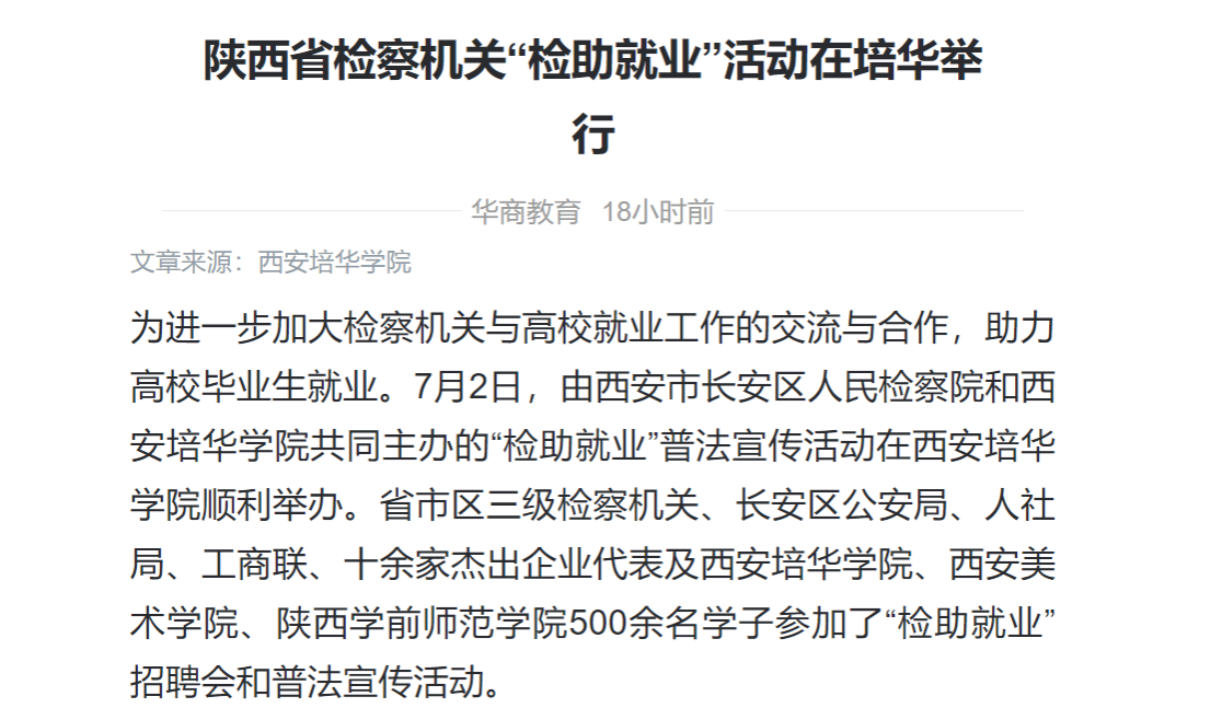 为进一步加大检察机关与高校就业工作的交流与合作,助力高校毕业生就业。7月2日,由西安市长安区人民检察院和西安培华学院共同主办的“检助就业”普法宣传活动在西安培华学院顺利举办。省市区三级检察机关、长安区公安局、人社局、工商联、十余家杰出企业代表及西安培华学院、西安美术学院、陕西学前师范学院500余名学子参加了“检助就业”招聘会和普法宣传活动。