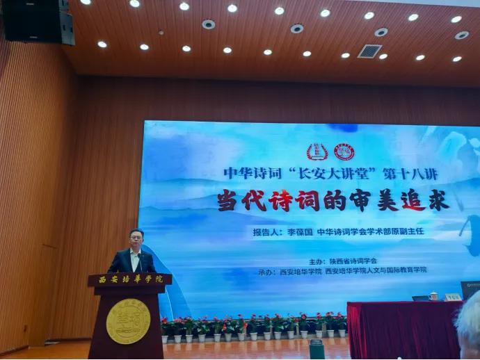 3月15日,由陕西省诗词学会主办,西安培华学院及学校人文与国际教育学院承办的中华诗词“长安大讲堂”第十八讲,在西安培华学院维之图书馆报告厅圆满举行。本次讲座聚焦“当代诗词的审美追求”,特邀中华诗词学会学术部原副主任李葆国先生担纲主讲。来自全国各地的诗词爱好者、西安培华学院人文与国际教育学院中文系全体教师以及部分学生,共计400余人齐聚一堂,共享这场诗词盛宴。