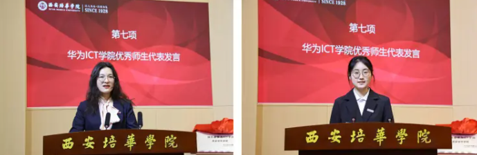优秀教师代表、智能科学与工程学院刘冰老师,优秀学生代表、智能科学与工程学院计算机科学与技术2206班的白雨鑫同学分别就培华师生在产教融合中个人专业素养的提升进行了分享。