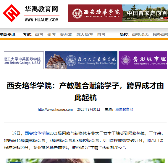 近日,西安培华学院2021级网络与新媒体专业大三女生王琼受到网络热捧,三年来,她斩获16项国家级荣誉、3项省级荣誉和8项校级荣誉,9门课程成绩突破95分,30余门课程成绩超90分,专业排名稳居前3%,被赞称为“学霸”“永动机少女”。