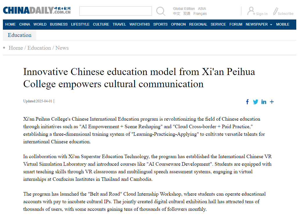 Xi'an Peihua College's Chinese International Education program is revolutionizing the field of Chinese education through initiatives such as "AI Empowerment + Scene Reshaping" and "Cloud Cross-border + Paid Practice," establishing a three-dimensional training system of "Learning-Practicing-Applying" to cultivate versatile talents for international Chinese education.
