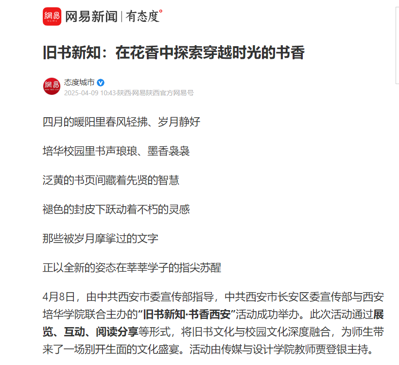 4月8日,由中共西安市委宣传部指导,中共西安市长安区委宣传部与西安培华学院联合主办的“旧书新知·书香西安”活动成功举办。此次活动通过展览、互动、阅读分享等形式,将旧书文化与校园文化深度融合,为师生带来了一场别开生面的文化盛宴。活动由传媒与设计学院教师贾登银主持。