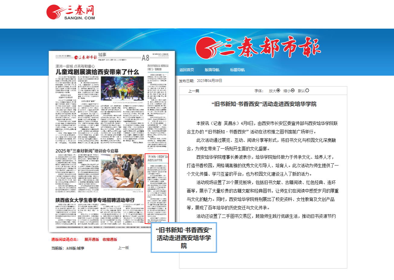 本报讯(记者 吴昌永)4月8日,由西安市长安区委宣传部与西安培华学院联合主办的“旧书新知·书香西安”活动在该校维之图书馆前广场举行。