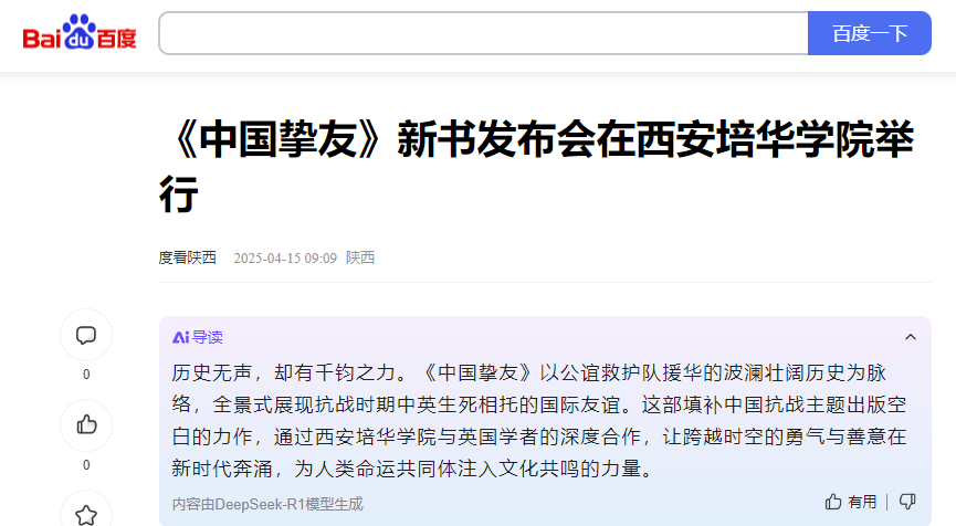 理事长姜波表示,学校秉持开放包容的办学姿态,致力于推动文化交流与合作,未来将为构建人类命运共同体贡献力量。西安出版社编辑部主任张正原,陕西省社会组织国际交流促进会副会长李敬喜,原陕西省作家协会党组书记雷涛,西北政法大学教授牛宝华,陕西省工合协会秘书长、西安培华学院副教授秦泉安分别表示,该书是中外文化交流的重要成果,将进一步加深中英两国人民的了解与友谊。