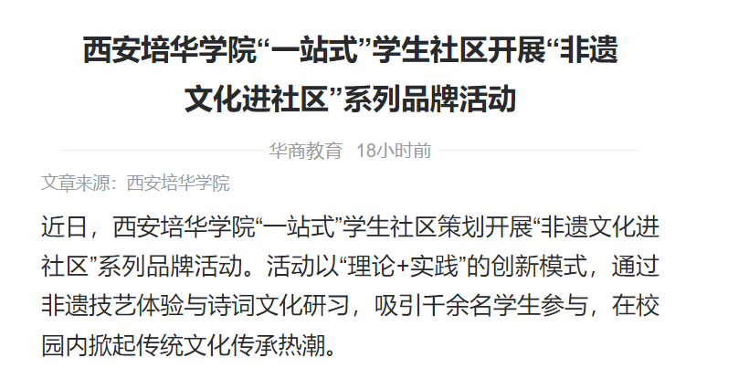 近日,西安培华学院“一站式”学生社区策划开展“非遗文化进社区”系列品牌活动。活动以“理论+实践”的创新模式,通过非遗技艺体验与诗词文化研习,吸引千余名学生参与,在校园内掀起传统文化传承热潮。