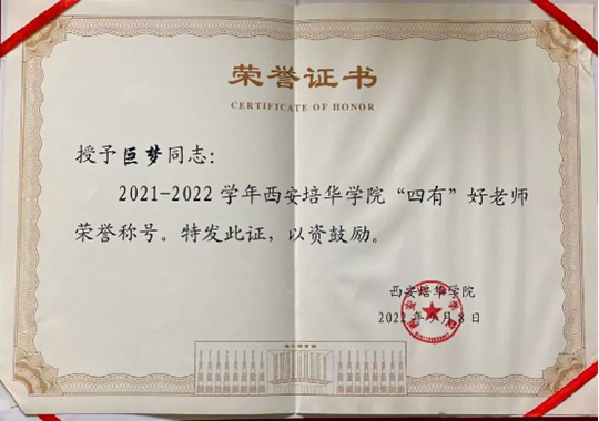 她扎根讲台十余载,用“择一事终一生”的执着,诠释了新时代青年教师的使命担当,做学生成长路上的“点灯人”,用奋斗书写属于青年教师的时代答卷,她是培华青年教师巨梦。在第十二届"'中国梦?青年志'——寻找身边的陕西好青年"颁奖仪式上,她荣获“爱岗敬业好青年”荣誉称号。