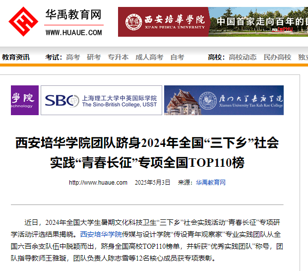 近日,2024年全国大学生暑期文化科技卫生“三下乡”社会实践活动“青春长征”专项研学活动评选结果揭晓。西安培华学院传媒与设计学院“传设青年观察家”专业实践团队从全国六百余支队伍中脱颖而出,跻身全国高校TOP110榜单,并斩获“优秀实践团队”称号,团队指导教师王雅璇,团队负责人陈志雪等12名核心成员获专项表彰。